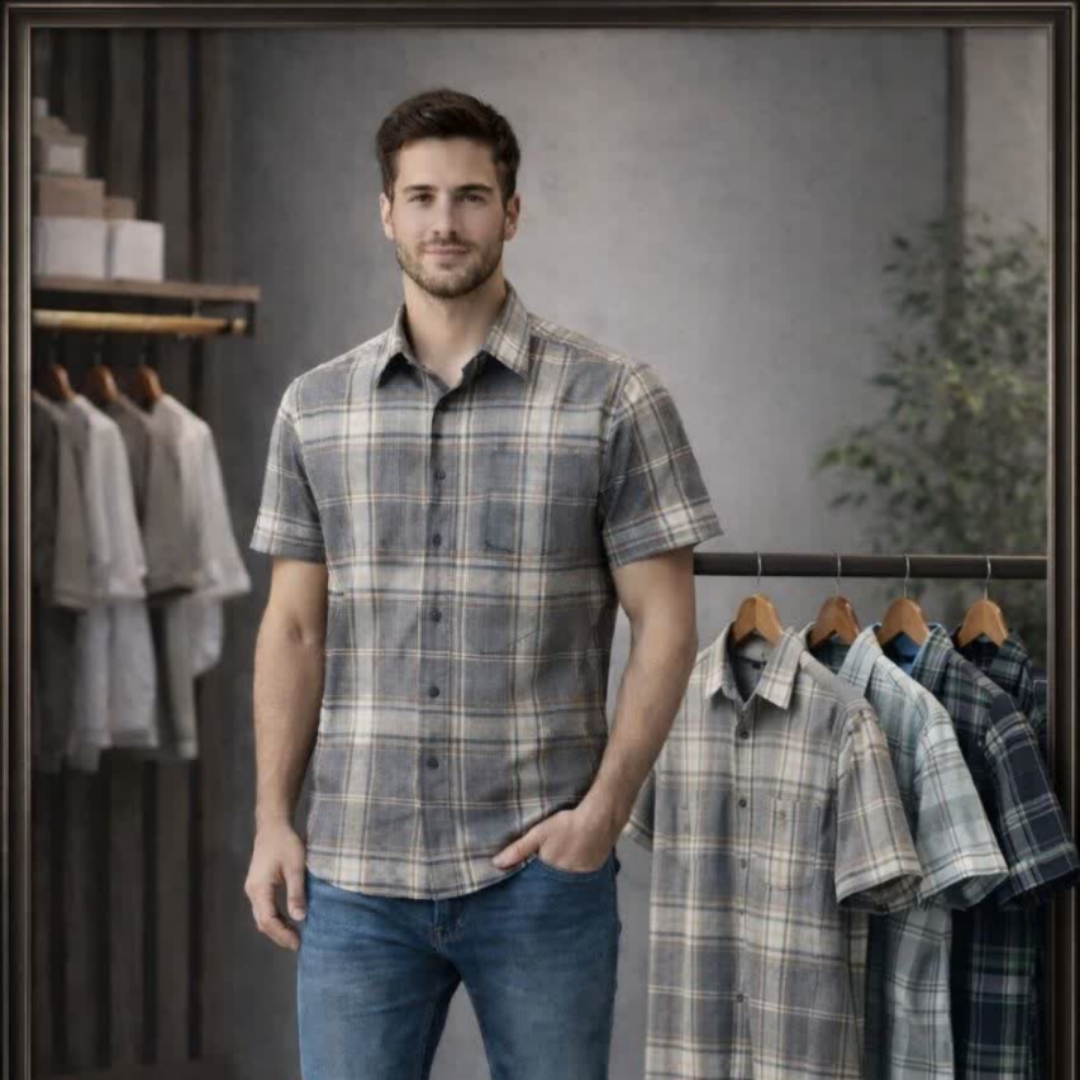 پیراهن چهارخانه اندامی آستین کوتاه پارچه کنفی کشی (پارچه وارداتی)